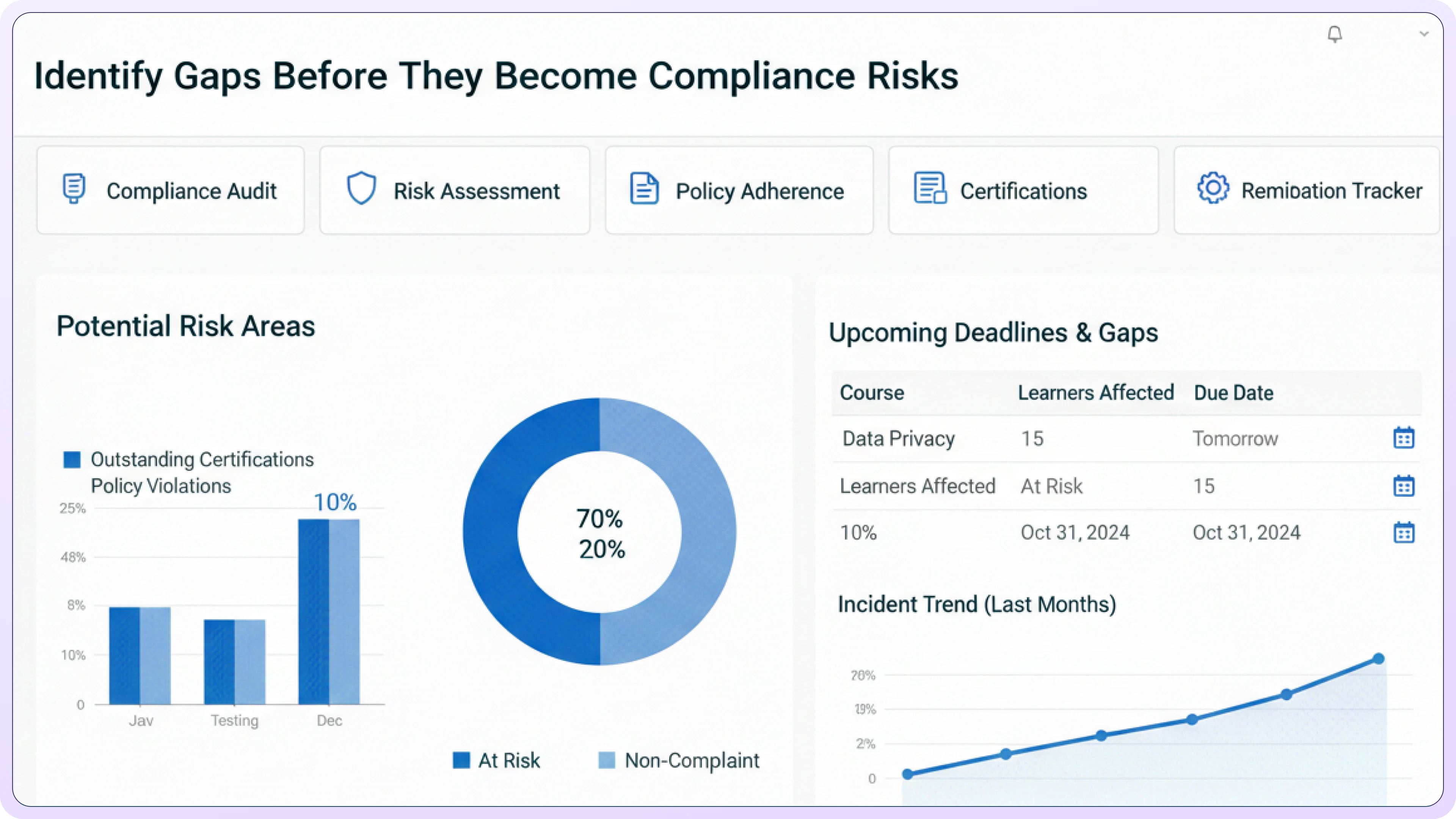 Automatically detect training gaps based on role, regulatory timelines, and organizational requirements.